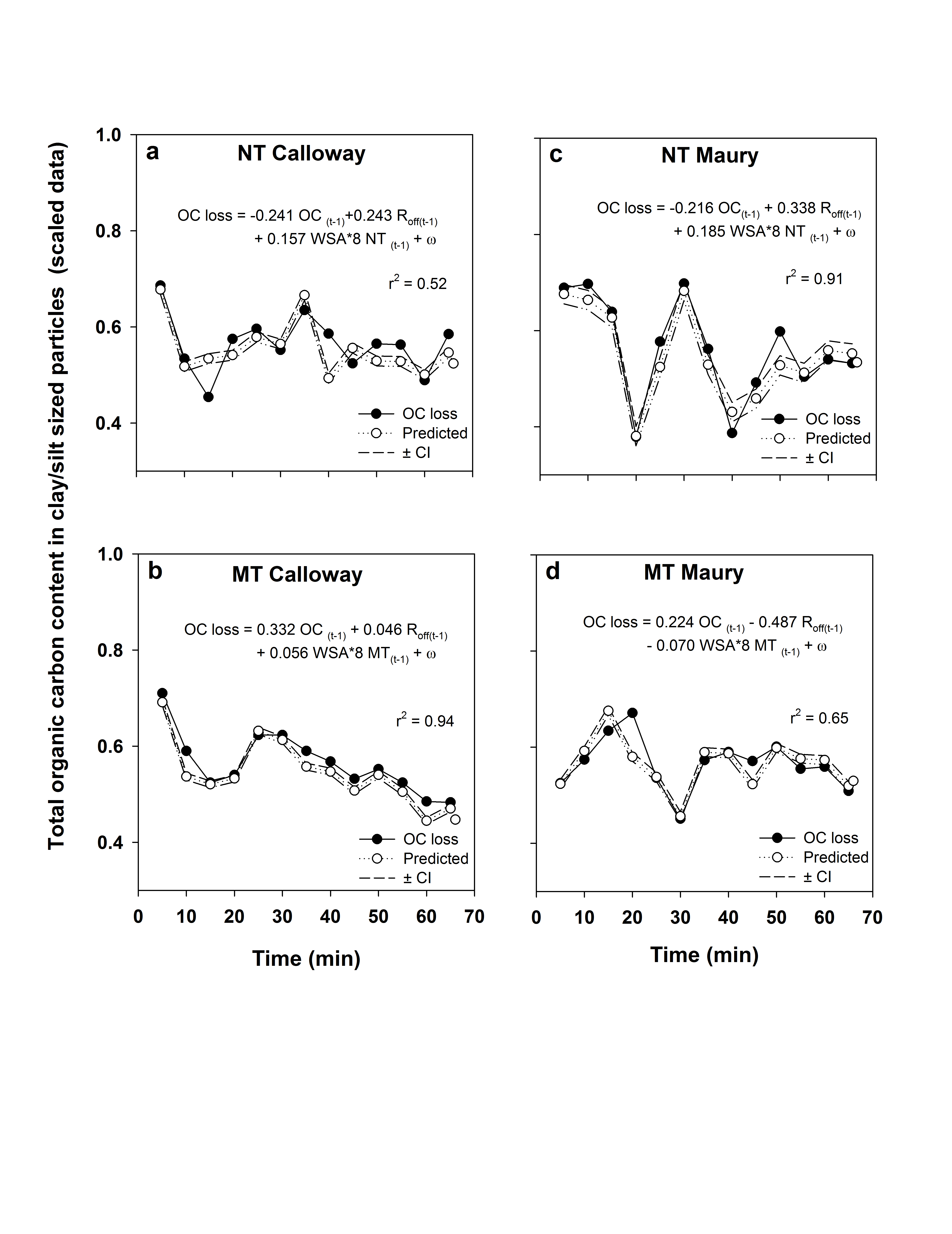 Based on my publication in Catena (2017), the Figure illustrates the evolution of OC content in clay/silt size particles measured every 5 minutes from two different soils in Kentucky. The equation created with a State space model shows the variables used for the prediction.