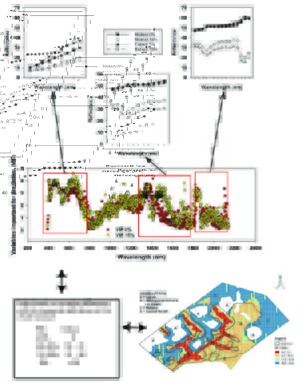 The Figure illustrates the procedure used to create a simple index based on precise laboratory-created database, and data from a sandy loam soil field (approx. 254 acres) . The Index was based on a limit of 25% of soil water content (light blue color in the map, where red color represents almost dry soils) and the average reflectance established for each one of the VIP selected regions.